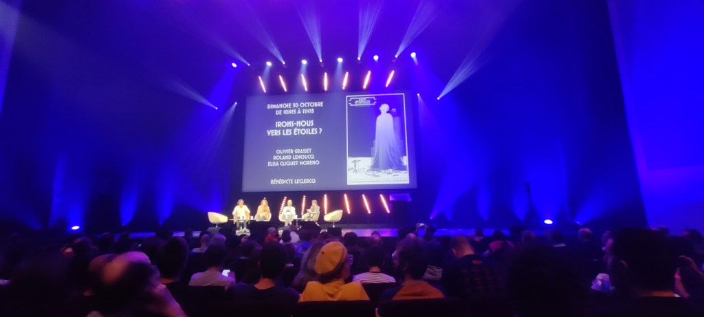 La discussion entre les intervants aux CV fabuleux (Roland Lehoucq, Olivier Grasset, Elisa Cliquet Moreno). Ils ont parlé de la faisabilité d’aller vers Mars, depuis la Terre, depuis la lune. On a parlé faisabilité technologique, faisabilité temporelle. Un régal pour la fan de hard SF que je suis. Conclusion : on ira voir les étoiles, lentement. Aller et marcher sur Mars fait plus rêver que la Lune et puis finalement, on a assisté à la naissance d’un nouveau projet spatial, et ça c’était beau.