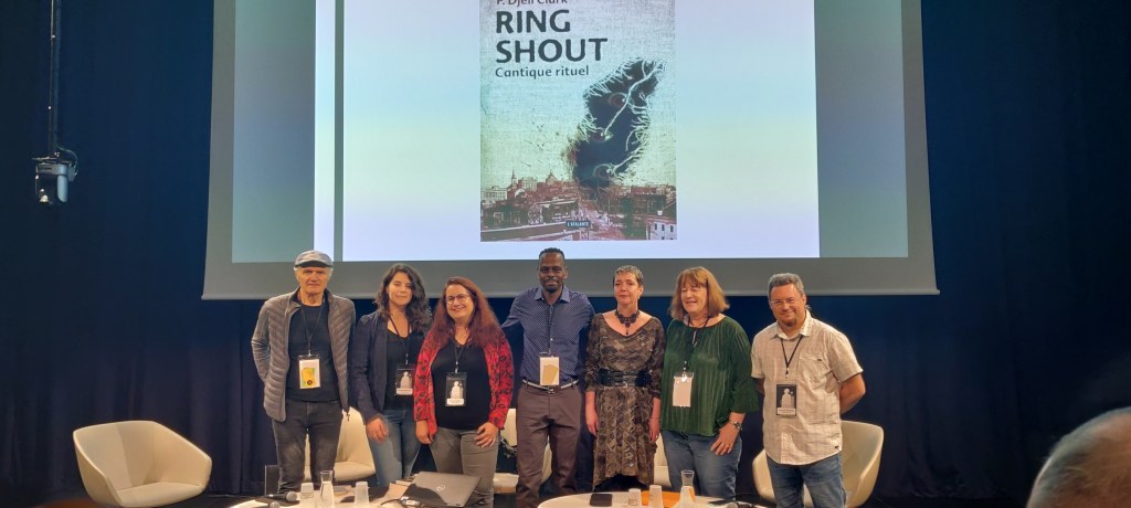 Pour clôturer en beauté ce weekend hors du temps, j’ai décidé d’assister à la remise du prix Julia Verlanger. Beaucoup d’hommages emplis de tendresse et d’admiration ont été faits à Roland C. Wagner. Ensuite, le jury a lu des extraits de chacun des textes sélectionnés avant de rendre son verdict. Sans suprise, pour ma part, et bien qu’il ait eu en face de lui de sérieux concurrents, c’est P.Djèli Clark qui reçoit le prix pour son titre Ring Shout.
