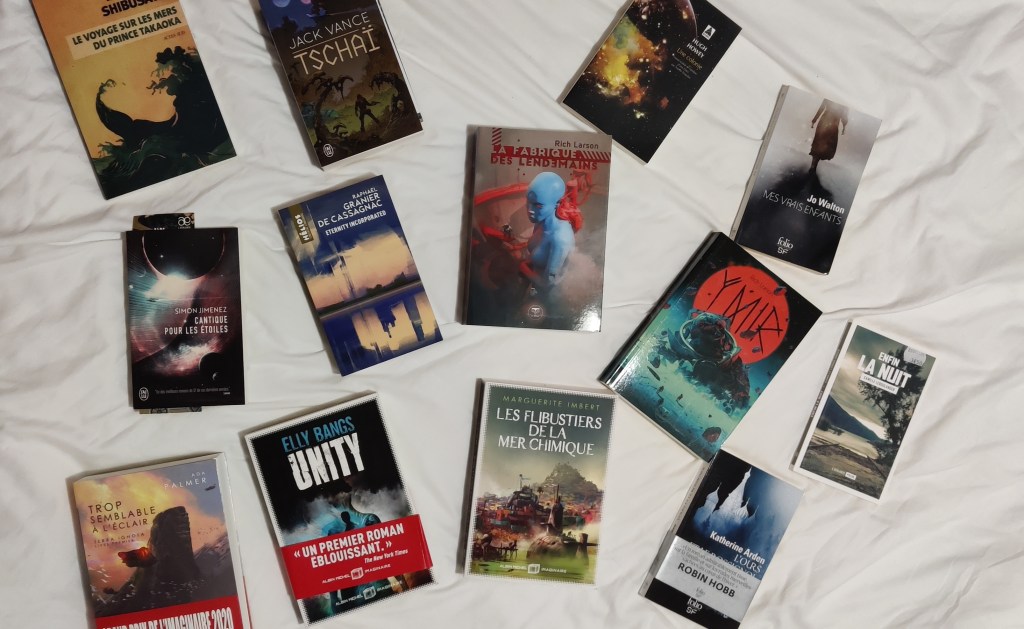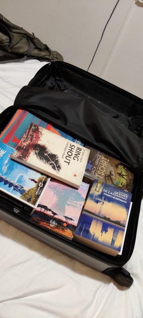Forcément, je n’allais pas revenir les mains vides de Nantes. J’en ai profité pour découvrir la magnifique libraire l’Atalante à laquelle j’ai craqué, totalement. Quelques achats en seconde main, au gré des bouquineries et des petits marchés aux livres dans les rues de Nantes, et puis aussi, forcément les achats à la librairie des Utopiales. Très heureuse d’ailleurs d’avoir eu l’appartement à 1 minute à pied de la cité des congrès afin de délester mon dos.